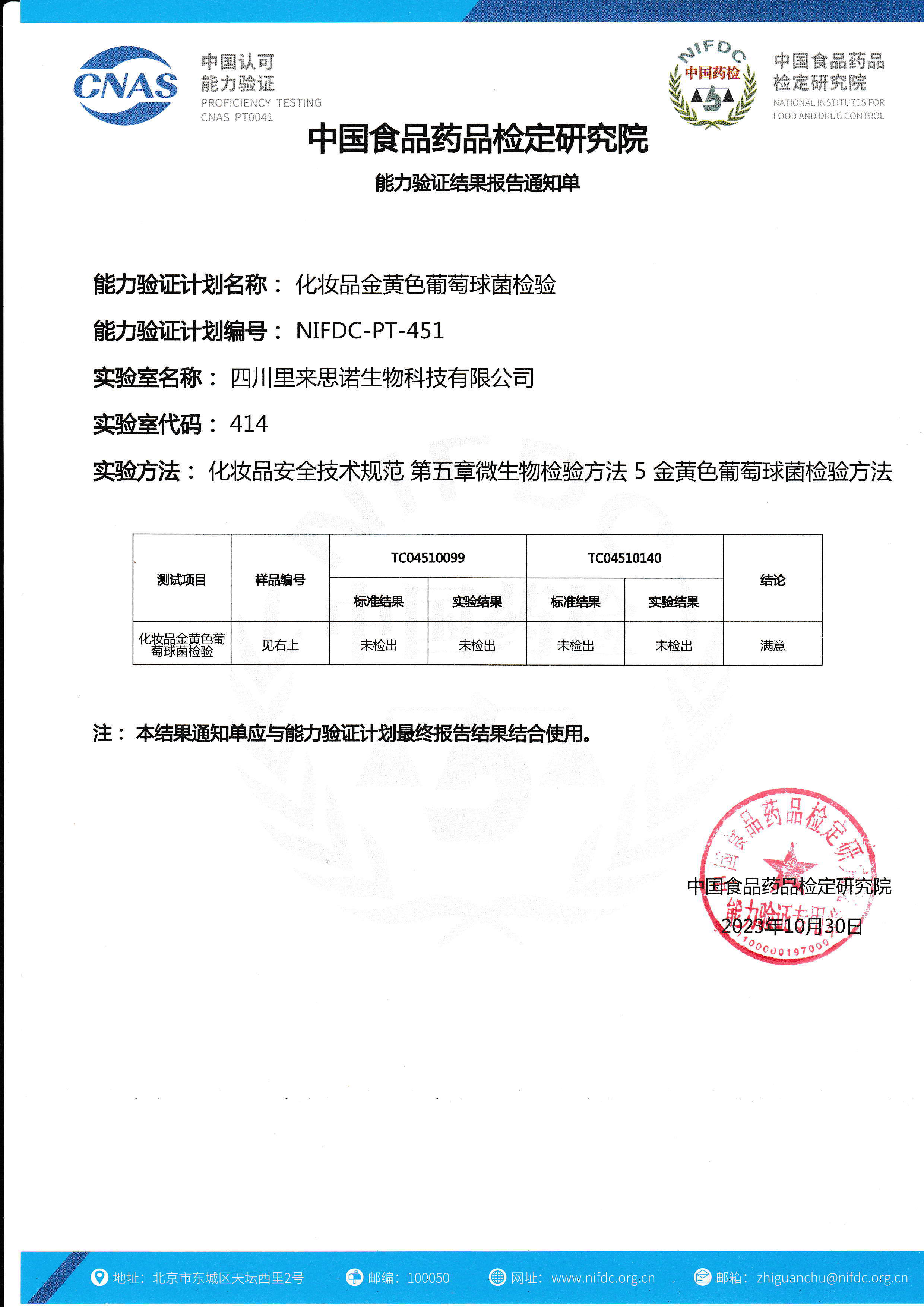 化妝品葡萄球菌檢驗(yàn)CNAS能力驗(yàn)證滿意證書