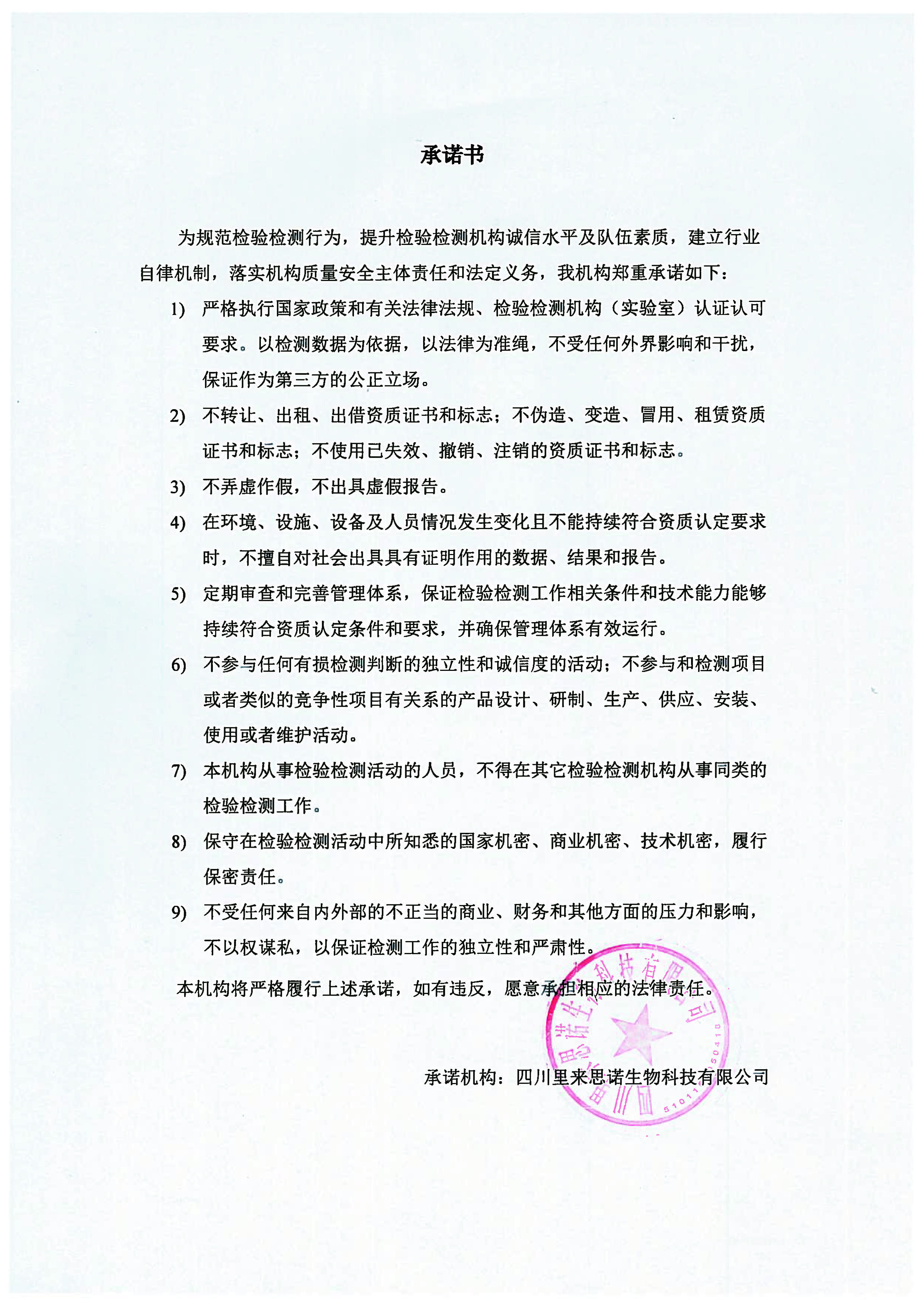 關(guān)于遵守法定要求、獨(dú)立公正從業(yè)、履行社會(huì)責(zé)任、嚴(yán)守誠實(shí)信用的自我承諾