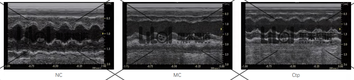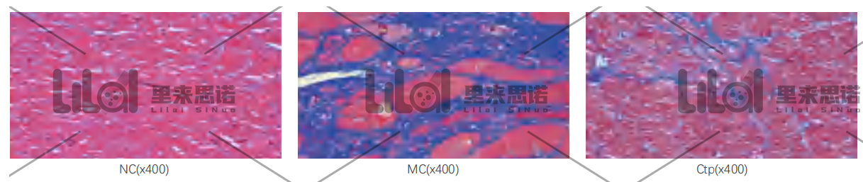 · Masson染色:與NC組相比,MC組大鼠膠原容積分?jǐn)?shù)(CVF)顯著升高,心肌纖維化明顯增加(藍(lán)色增多),Ctp能減少心衰大鼠心肌纖維化(p<0.01)。