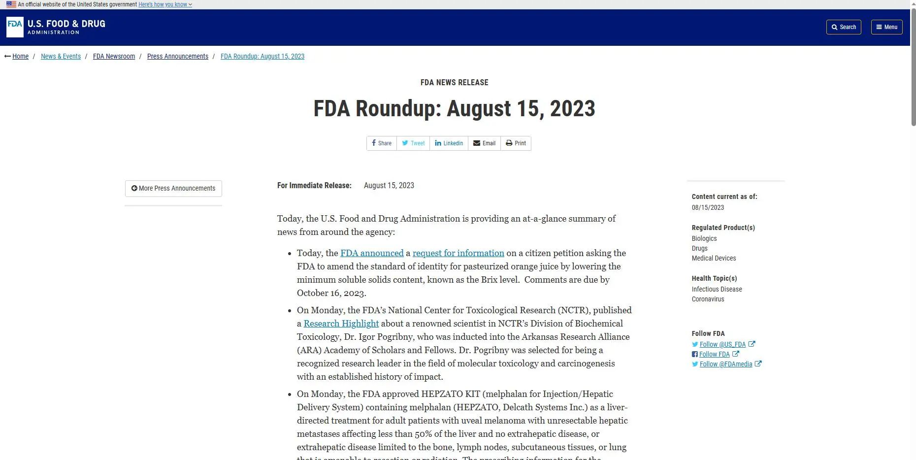 美國FDA官方動態(tài)