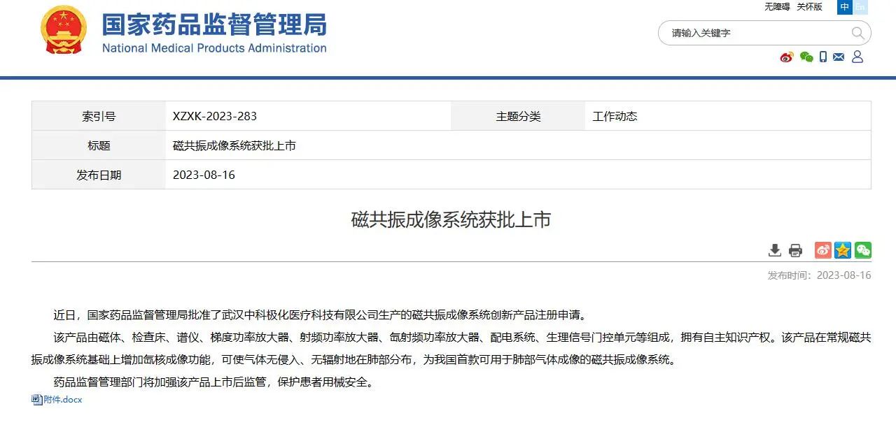 近日,國家藥品監(jiān)督管理局批準了武漢中科極化醫(yī)療科技有限公司生產(chǎn)的磁共振成像系統(tǒng)創(chuàng)新產(chǎn)品注冊申請。