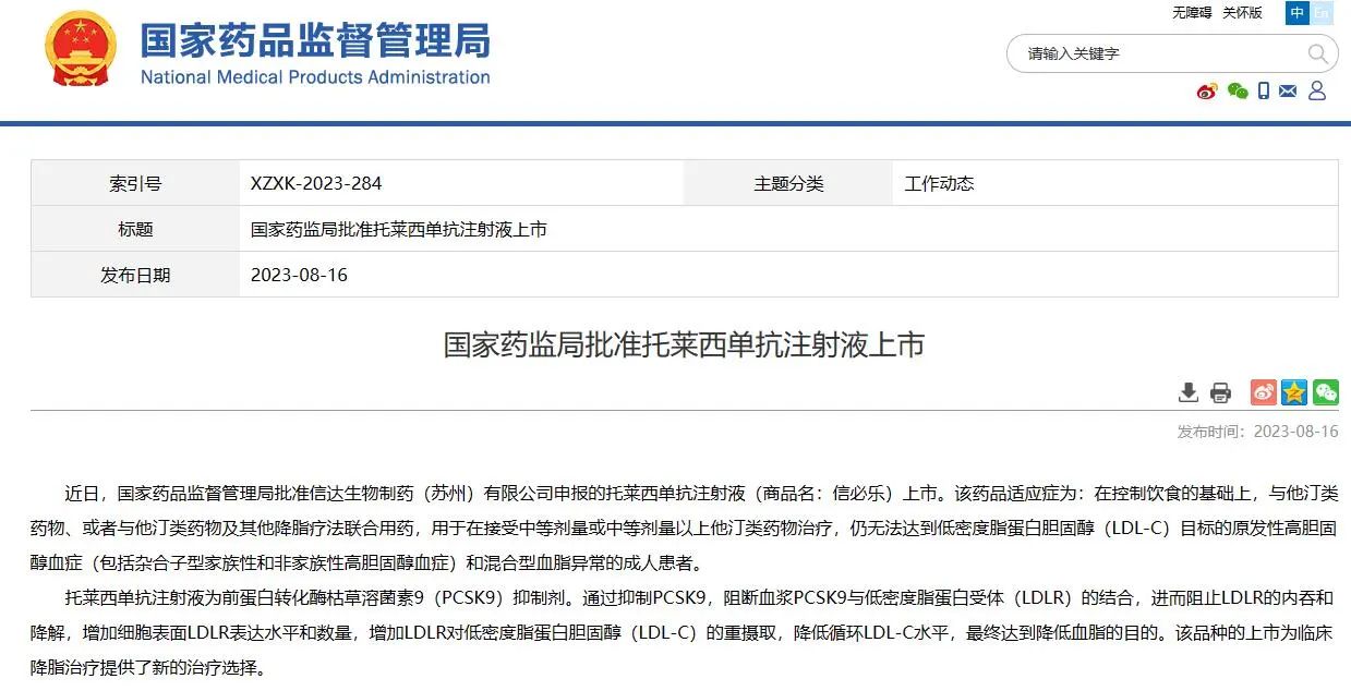 05 國家藥監(jiān)局批準托萊西單抗注射液上市