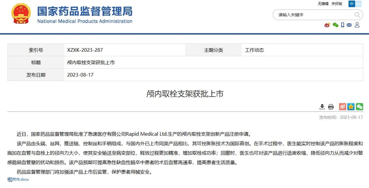 近日,國家藥品監(jiān)督管理局批準了急速醫(yī)療有限公司Rapid Medical Ltd.生產(chǎn)的顱內(nèi)取栓支架創(chuàng)新產(chǎn)品注冊申請。