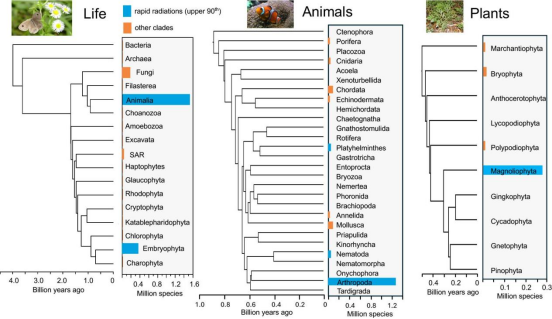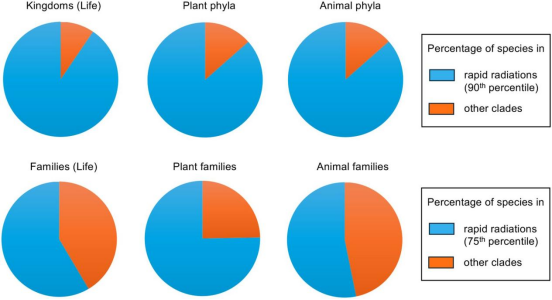圖3:屬于快速輻射和其他進(jìn)化枝、跨生命和跨植物和動(dòng)物的物種百分比。