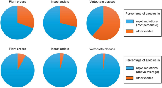 圖4:屬于快速輻射和其他進(jìn)化枝的物種豐富度在陸地植物目、昆蟲目和脊椎動(dòng)物類別中的百分比。