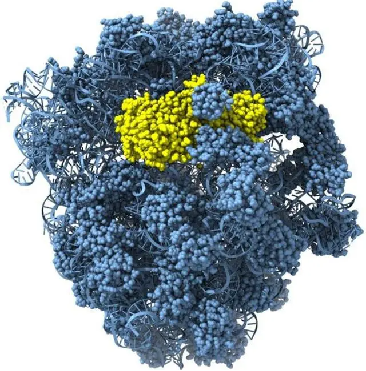 圖片信息:葡萄異染色質(zhì)菌CAMI 1蛋白(黃色)結(jié)合大腸桿菌核糖體(藍(lán)色)的低溫電子顯微鏡結(jié)構(gòu)。